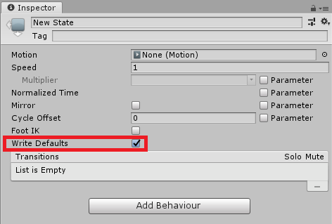 - AnimatorControllerにあるStateのWriteDefaultsはオフ(チェックが入っていない状態)にする